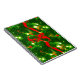Notebook in a pattern of Christmas tree branches lit with white lights, and decorated with garlands of red ribbon