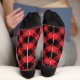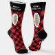 These socks feature a red and black chequered pattern with a Christmas tree on each side. On the top of each sock there is a black band with the words, "MERRY CHRISTMAS".