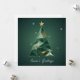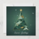 A sleek and stylish Christmas card featuring an abstract geometric tree crafted from triangular shapes in a gradient of emerald green, sage, and metallic gold. Crisp lines and minimalist snowflakes on a white background add a contemporary touch. The elegant sans-serif text 'Season's Greetings' completes this design-forward holiday card.