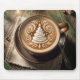 A beautifully detailed latte art in a brown coffee cup showcases a Christmas tree design.