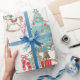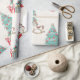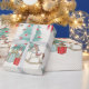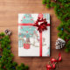 Holiday wrapping paper with Christmas tree, presents and rocking horse on a light golden polka dot background.