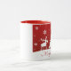 Modern minimalist simple Christmas illustration featuring white silhouettes of reindeer, tree, snowman and snowflakes with Merry Christmas greeting on a red background.