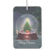 A large snow globe with a festive red base containing a decorated Christmas tree with a bright yellow star on top and colourful presents sits in a snowy forest at night with a full moon in the background.