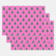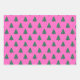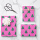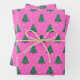 A cute trio of wrapping papers featuring a pattern of Christmas trees, gold stars, snowfall on a pink background.