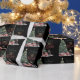 This is a festive and traditional holiday illustration centered around a richly decorated Christmas tree and a collection of wrapped gifts. The tree is a deep green, adorned with warm string lights, white, red, and gold ornaments, and topped with a bright star. At its base are several red, white, and gold presents tied with bows, resting on a snowy or frosted ground. To the right, four lit candles in a black candelabra cast a warm glow. The image is overlaid with elegant, large script that reads "The Season" in dark green and gold, and "The Reason" in deep red, conveying a classic holiday message.