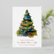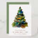 Christmas Tree Watercolor Merry Jolly Happy Foil Holiday Card. Happy, merry, jolly wishes and your family name - add your text. The text is in real rose gold foil. Artistic watercolor drawing of a colourful Christmas tree. Festive design for your Christmas card. Personalise the card with your text.