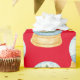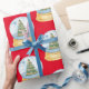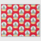 Festive holiday gift wrap features pattern of watercolor snow globes with Christmas tree on red background.
