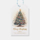 Cute and festive holiday gift tags featuring Christmas tree, ornaments with text "Merry Christmas" shown below in a gilden. Personalise the gift tag with your name. The back of the tag features a snowy golden background.