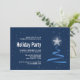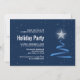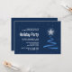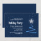 A holiday party invitation, featuring an abstract illustration of a Christmas tree with a snowflake as a Christmas Ornament against a blue background.