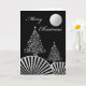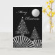 Christmas Trees and Moon, Modern Silver Design Card. Merry Christmas greeting card with modern silver toned Christmas trees and geometric circular snowy hills on a black background. A silvery moon is in the sky above the trees. Add a name or other text to the cover if desired. Art, image, and verse copyright © Shoaff Ballanger Studios.