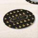 This paper coaster design features a pattern of stylised Christmas trees and snowflakes in shades of gold on a black background. Optional 'Happy Holidays' text and a label have been provided to add your name and/or other text. Search ID861 thru ID864 to see additional colour options and other products in this modern, Christmas design set.