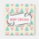 A magnet with a festive christmas pattern on a cream coloured background. Illustrations of pastel coloured, greenish-blue, christmas trees and pastel pink baubles and bows in a repeating pattern. In the centre a cute whimsical frame in a handdrawn style which says Merry Christmas in the centre. Has a nice retro flair.
