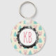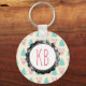 A stylish retro themed keychain with a vintage grunge style circle with your monogram initials in the centre. The background design is a festive christmas pattern on a cream colour. Illustrations of pastel coloured, greenish-blue, christmas trees and pastel pink baubles and bows in a repeating pattern.