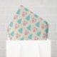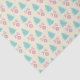 Tissue paper with a festive christmas pattern on a cream coloured background. Illustrations of pastel coloured, greenish-blue, christmas trees and pastel pink baubles and bows in a repeating pattern.