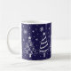 Blue Christmas Coffee Mug with white chalkboard style Christmas Trees and Snowflakes doodles. Cool winter sky design featuring white christmas trees and snowflakes on blue. Modern, elegant design ideal for a winter holidays and Christmas gift. Features Digital Art based on Hand Drawn Doodles.