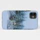 A photograph of a light blue phone case with a winter scene on the back. The scene depicts a snow-covered forest with tall evergreen trees heavily laden with snow. In the middle of the forest, there is a small, colourful playground structure, also covered in snow. The sky is overcast, creating a soft, diffused light that mutes the colours and gives the scene a cold, wintry feel. The composition is balanced, with the trees framing the playground in the centre. The overall effect is peaceful and serene, capturing the quiet beauty of a winter landscape. The image is sharp and clear, with good detail in the trees and snow.