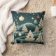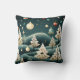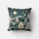 Pretty Mid Century Modern style throw pillow. Cute impressionist style, white Christmas trees decorated with beautiful ornaments and stars, stand among rolling, snowy hills .