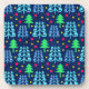 Green, blue and turquoise decorative Christmas trees with yellow and red snow on a dark blue background.
