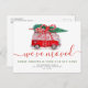 modern design comprising of red holiday script and a christmas truck. The text and colours can be personalised.