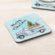 Coasters with a festive holiday design. A truck carrying Christmas pine trees along with some woodland animals. A bear a fox and a deer standing in the back going for a ride. Design created with watercolors.
