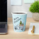 Paper cups with a festive holiday design. A truck carrying Christmas pine trees along with some woodland animals. A bear a fox and a deer standing in the back going for a ride. Design created with watercolors.