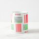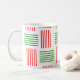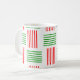 This mug has a mid-century modern design that looks like a weave with red and green lines on a field of white.