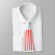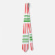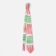 This tie has a mid-century modern design that looks like a weave with red and green lines on a field of white.