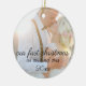 Beautiful Christmas gift for newlyweds. This holiday season, send this beautiful Christmas photo of the wedding to celebrate their wedding. Our first Christmas decoration is adorned with a handwritten black line with space for one picture. Personalise the ornament by replacing images and text. For best results, use a cropped image as a square. More styles and matching envelopes, postage stamps, gift wrapping paper, etc. Also available in our store. Please contact the designer directly if you have a design customisation request.