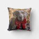 A Weimaraner dog with a shiny gray coat wears a large red bow. In the background, decorated white Christmas trees with lights and golden ornaments create a festive ambiance