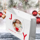 A modern minimalist Christmas gift bag in red and white. A chic white background, with the word JOY written with red bold letters. The letter O is used as a photo frame. Personalise and add your own family photo, name and year.