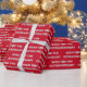 "Wish for the extraordinary" text on red background with silver snowflakes.