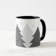 This ceramic coffee mug is shown in a refreshing image of woodlands fir tree print. Snowflakes grace the mug cascading down from the rim.