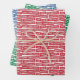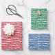 A wrapping paper sheet set with Christmas words. The pattern features the words 'Merry Christmas', 'Hohoho', 'Santa', 'Peace', 'Celebrate', 'Joy', 'Happy Holidays' and 'Love'. Sheets in red and white, green and white, and blue and white. Customise the pattern size, background colour and more.