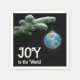 "Joy to the World" text with globe ornament hangs from a snowy pine tree branch, illuminated against a black night sky filled with shimmering stars.