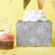 This wrapping paper is shown with a Christmas holiday pinecones and snowflakes print.