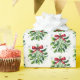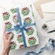 Holiday gift wrapping paper is shown in a festive Christmas mistletoe and snowflakes print.