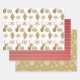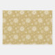This wrapping paper sheets set is shown in a festive Christmas holiday colours of muted burgundy, white and gold-tone colours, Prints of snowflakes, Christmas trees and reindeer on one sheet; Burgundy and gold-tone stripes on another. The third sheet is white snowflake images on gold-tone paper.