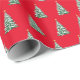 Holiday gift wrapping paper shown in a red background colour with a festive Christmas tree print.