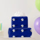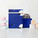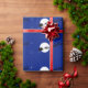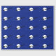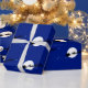 Christmas wrapping paper with Santa in his sleigh with reindeer in silhouette surrounded by many stars and a full moon against a blue background at night.