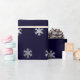 Christmas wrapping paper with a pattern of faux silver snowflakes on a dark blue background.