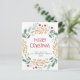 This elegant and stylish Christmas card features a colourful wreath with green and gold leaves and red berries, as well as script typography with "Merry Christmas" message on a white background. The back of the card has a matching design with room to add a personal message.