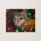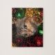 Festive Christmas jig saw puzzle featuring a cute cat peeking through Christmas wreath decorations. Measures 8" x 10" inches. 110 Pieces.