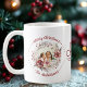 This festive Christmas mug showcases a beautifully designed wreath adorned with vibrant flowers, clusters of berries, and leaves in red and beige tones on either side. Nestled within the wreath is a cherished family photograph, capturing a moment of joy. Above this image, a sophisticated "Merry Christmas" greeting is elegantly presented, while the family name is thoughtfully placed below, adding a personal flair. The text is enhanced by delightful red dots flanking both sides. Furthermore, the phrase "Merry Christmas" is prominently featured in the centre, rendered in a stylish font that adds to the overall charm of the design.