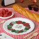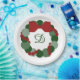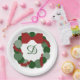 Add a special touch to your Christmas festivities with paper plates featuring a geometric Christmas wreath with a customisable monogram in the centre. The wreath in this original digital design is made of green dots in three different shades and sizes. A strand of smaller red dots reminiscent of cranberries winds around the circular pattern. The image is topped with a red bow.