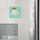 A magnet with an illustration of a cute little Christmas yeti, toy doll, wearing a red santa hat. The little yeti has a pull string to make him talk and he is covered in soft white fur with light brown accents. Background is a retro mint green colour.