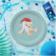 A paper plate with an illustration of a cute little Christmas yeti, toy doll, wearing a red santa hat. The little yeti has a pull string to make him talk and he is covered in soft white fur with light brown accents. Background is a retro green colour.
