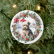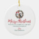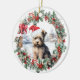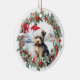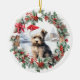 Cute Christmas ornament with a sweet yorkshire terrier yorkie dog puppy in a Santa hat in Christmas holly and berry wreath. Personalised dog, puppy, cute animal Christmas ornament (text on the back).