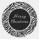 This round sticker is shown in a animal zebra print with a Merry Christmas wish.
