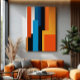 This abstract piece features vertical blocks in vibrant tones of orange, blue, black, and white, creating a harmonious and striking composition. Perfect for modern spaces, it radiates energy and balance through colour and geometry.