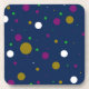 A pattern of variously sized circles in gold, white, purple, and green is scattered across a dark blue background. The circles are evenly spaced and vary in diameter.